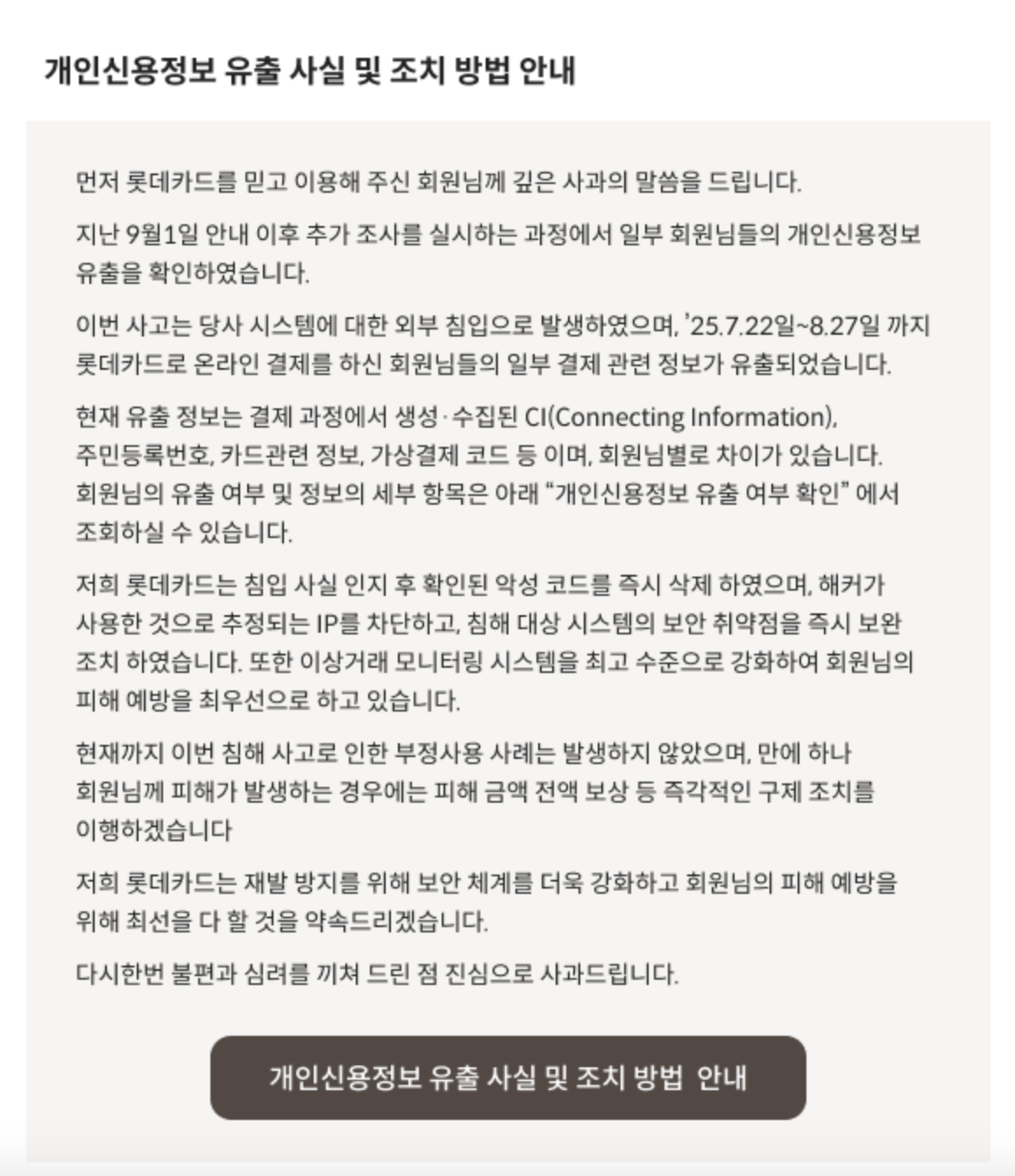 롯데카드 공식 홈페이지에 접속할 경우에도, 위와 같이 개인신용정보 유출 사실 및 조치 방법 안내문을 확인할 수 있습니다.